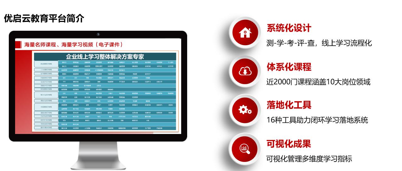 4.结果落地强:优启云教育从测、学、考、评、查5大维度,结合16种工具,有效解决学习流于形式,每门课程通关考核,保证学习的效果与落地性,提升企业岗位核心竞争力。